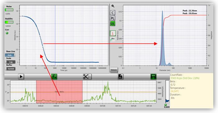 • 通過檢測器將光強的波動轉化為相關方程,根據相關方程得到光強波動的速度,再通過Stokes-Einstein方程得到粒子的粒徑d(h)以及尺寸的分佈資訊;