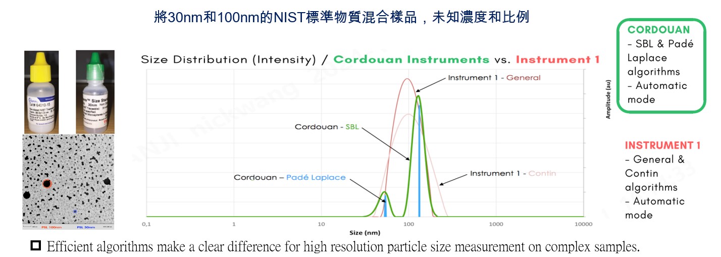 • 分析儀的分辨力是通過測量兩個單峰分佈細微性標準物質的分辨能力來評估的。