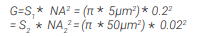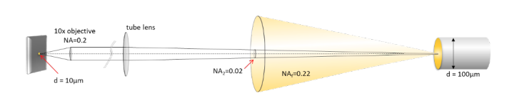 我們可以使用直徑100um的光纖作為點光源,其典型的數值孔徑NA為0.22。由於筒鏡的焦距是10x物鏡的 10 倍,它所能接收的光錐角會縮小為原始孔徑的 1/10,因此NA僅為 0.02。就 Etendue而言,下列等式成立: