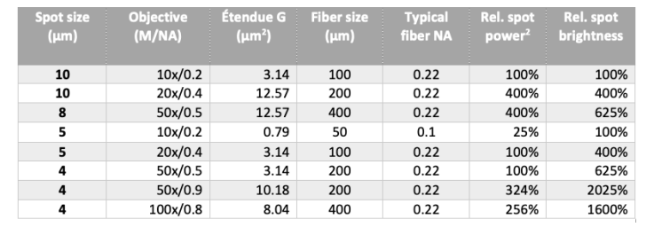 上述案例說明了對於此類應用,光源的亮度(Luminance)——即單位光源面積與單位立體角下的發射能量——是多麼地重要。由於光點本身的Etendue通常是整套系統的限制因素,因此我們應選用本身發光Etendue就很小的光源。只有具備極高點亮度的光源才能產生更亮的微米光點,例如:雷射(Laser)、高壓弧光燈(High pressure arc lamps)、雷射驅動電漿光源(LDLS)或是雷射激發螢光光源(Laser converter phosphors)。這些光源的體積可能很小,且不一定需要極高的總功率。此外,這些光源能有效地耦合進光纖中,使光纖輸出端也成為一個高亮度的光源。