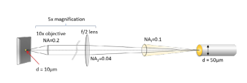 如果將焦距為f的tube lens更換為焦距僅有一半(f/2)的透鏡,不僅可以縮小架構體積,整體的倍率也會減半變成 5x,而照明端的數值孔徑(NA)則會倍增至 0.04。由於倍率降低,為了維持產出10um的光點,光纖(或光源)的尺寸也需對應縮小至50um。請注意,即使50um光纖的典型NA為0.1,仍足以填滿系統所使用的0.04NA。