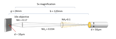 想像我們希望在樣本上產生一個直徑10um的光點。我們可以利用顯微鏡架構,將光源(例如光纖末端)成像到樣本表面來達成。