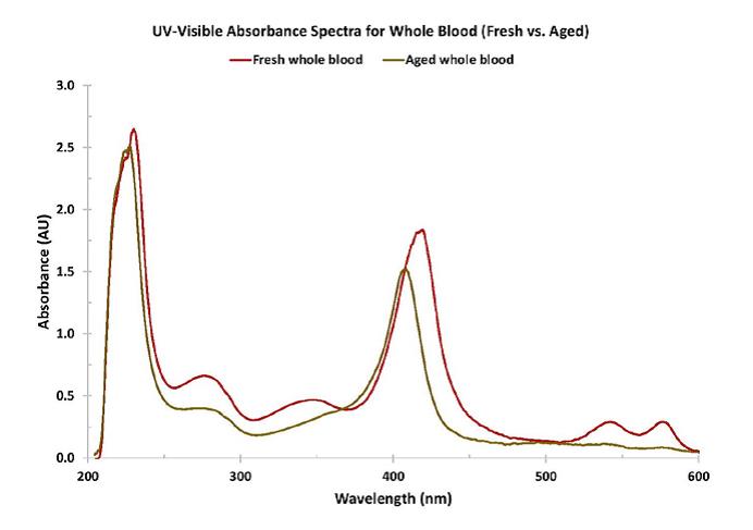 舉例來說,用在全血的紫外-可見光吸收光譜-尤其是光譜區域在500~600nm範圍,在血紅素中分子與血紅素基團鍵結可以被偵測到-單次測量即可揭示大量訊息,且每位患者的特徵各不相同(圖一)。